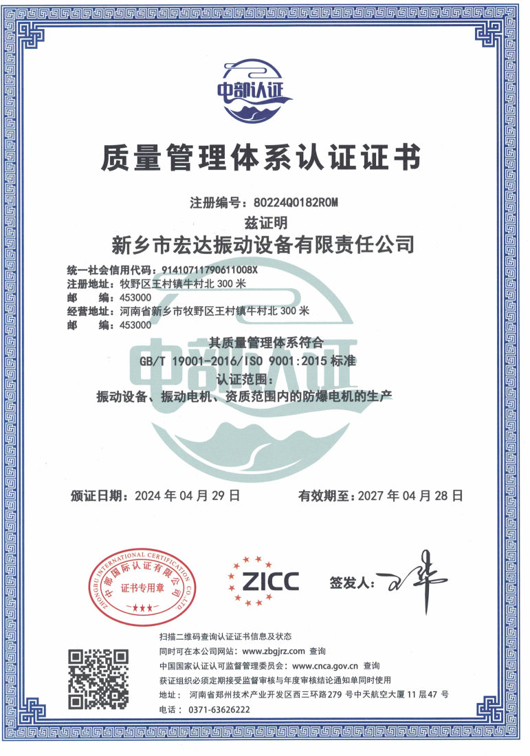 熱烈祝賀新鄉(xiāng)市宏達振動設備有限責任公司順利通過ISO9001質量管理體系認證