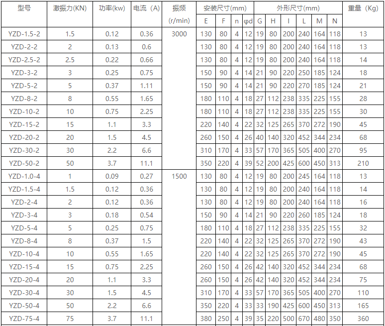 YZD系列振動電機相關(guān)技術(shù)參數(shù):